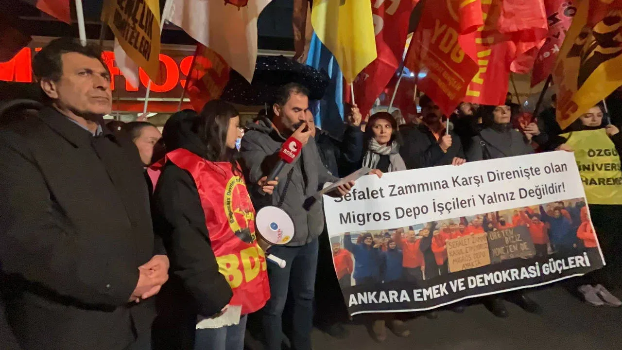 Ankara Emek ve Demokrasi Güçleri, direnen Migros Depo işçileriyle dayanışmak için Çankaya Ziya Gökalp Caddesi’ndeki Migros önünde basın açıklaması yaptı. Eylemde, sık sık “Direnen Migros işçisi kazanacak”, “Krizin faturası patronlara” ve “İnsanca bir yaşam istiyoruz” sloganları atıldı.