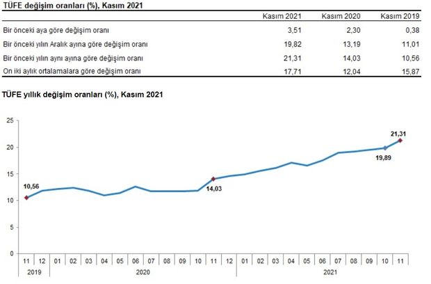 İşlenmemiş gıda ürünleri, enerji, alkollü içkiler ve tütün ile altın hariç TÜFE'de 2021 yılı Kasım ayında bir önceki aya göre yüzde 3,22, bir önceki yılın Aralık ayına göre yüzde 18,43, bir önceki yılın aynı ayına göre yüzde 19,75 ve on iki aylık ortalamalara göre yüzde 17,76 artış gerçekleşti.